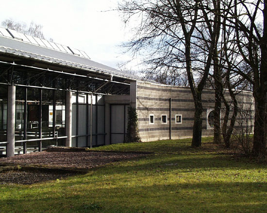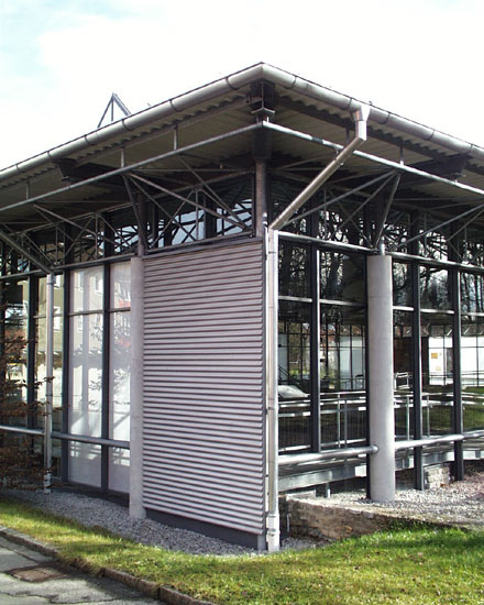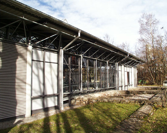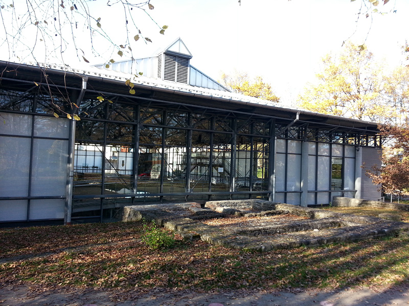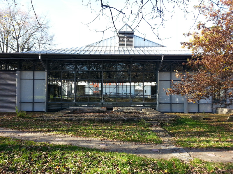 Schutzbau als neutraler Baukörper über Ausgrabungen römischer Thermen (entdeckt 1925)