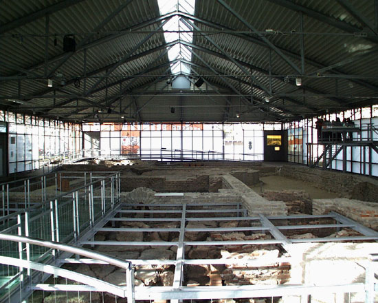 Über den Ausgrabungen der römischen Therme ist eine lichtdurchflutete Hülle aus Stahl und Glas gesetzt worden.