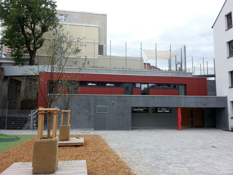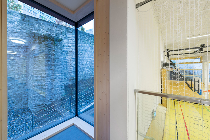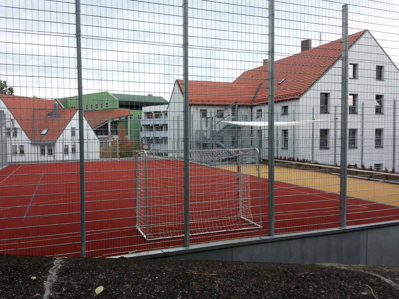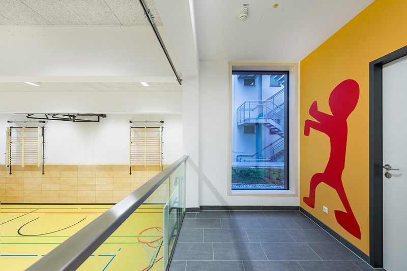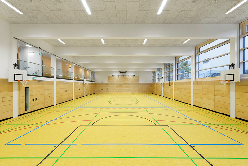 Die neue Sporthalle mit dem Allwetterplatz auf dem Dach, als eigenständiger Baukörper, soll bewusst in Form und Materialwahl erkennbar sein.